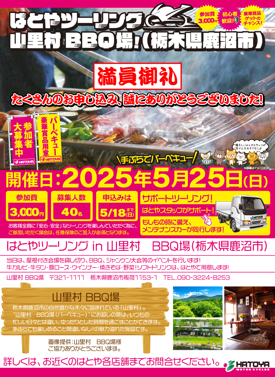 - 【満員御礼!受付終了!】はとやツーリングin山里村 BBQ場!
